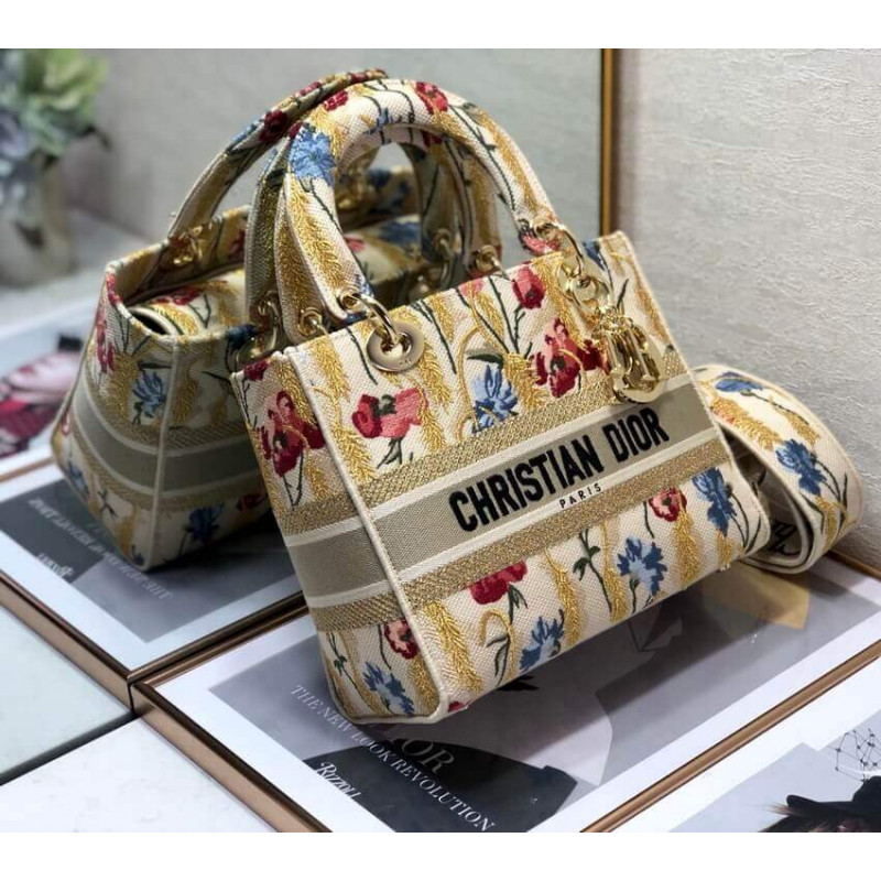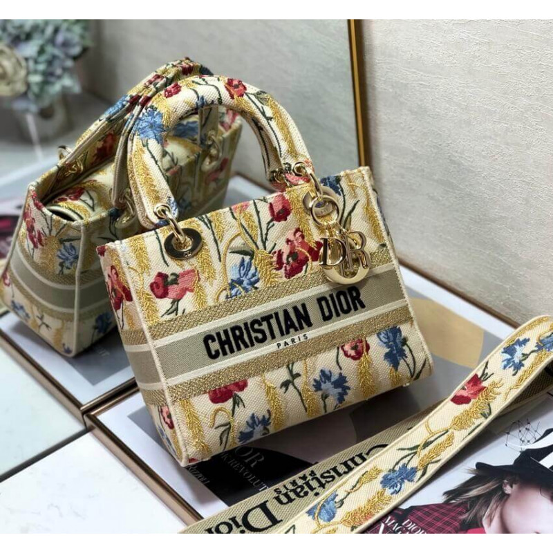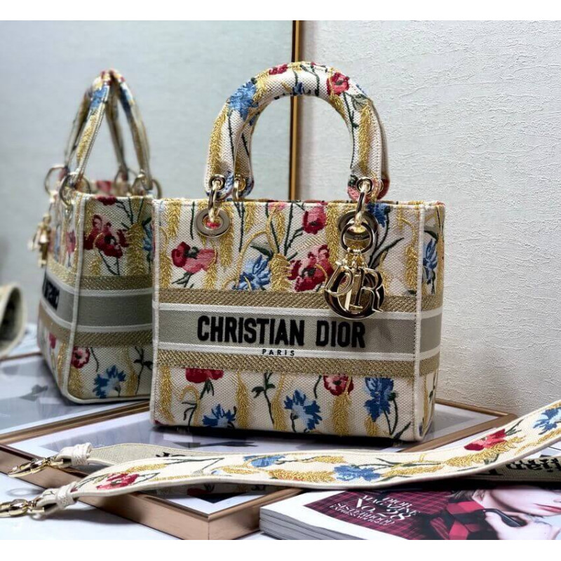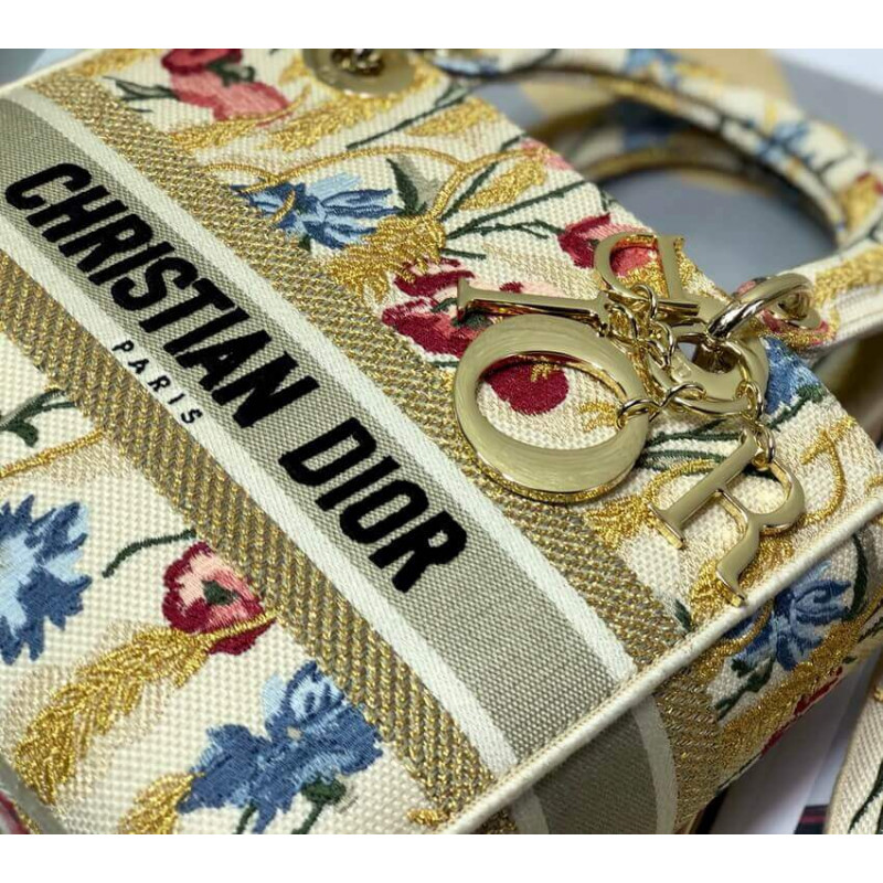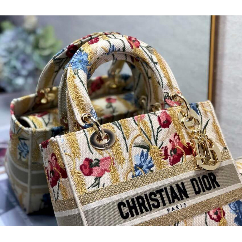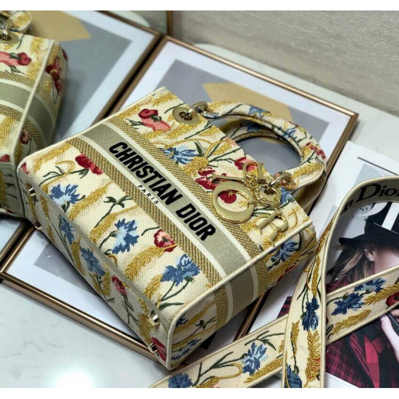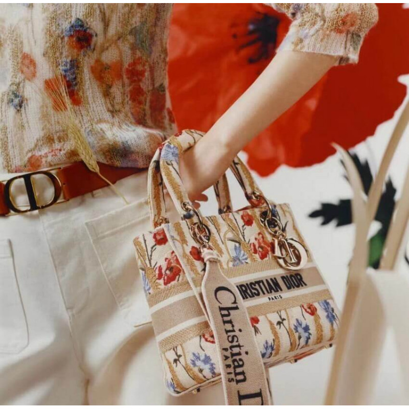 La borsetta Lady Dior incarna la visione di Eleganza e bellezza di Dior. raffinato e sofisticato, lo stile beige senza tempo ma rilevante è ricamato con il motivo di ibisco di Dior multicolore accentuato con filo metallico, che è ispirato ai paesaggi apuliani bucolici, uno dei temi centrali della collezione. Insieme alla firma di Christian Dior, presenta un fitto metallo pallido in oro-finitura D.I.O.R. ‘ Ciondolo e una tracolla in pelle rimovibile. La borsa media può essere abbinata alle altre creazioni di ibisco di Dior della collezione.