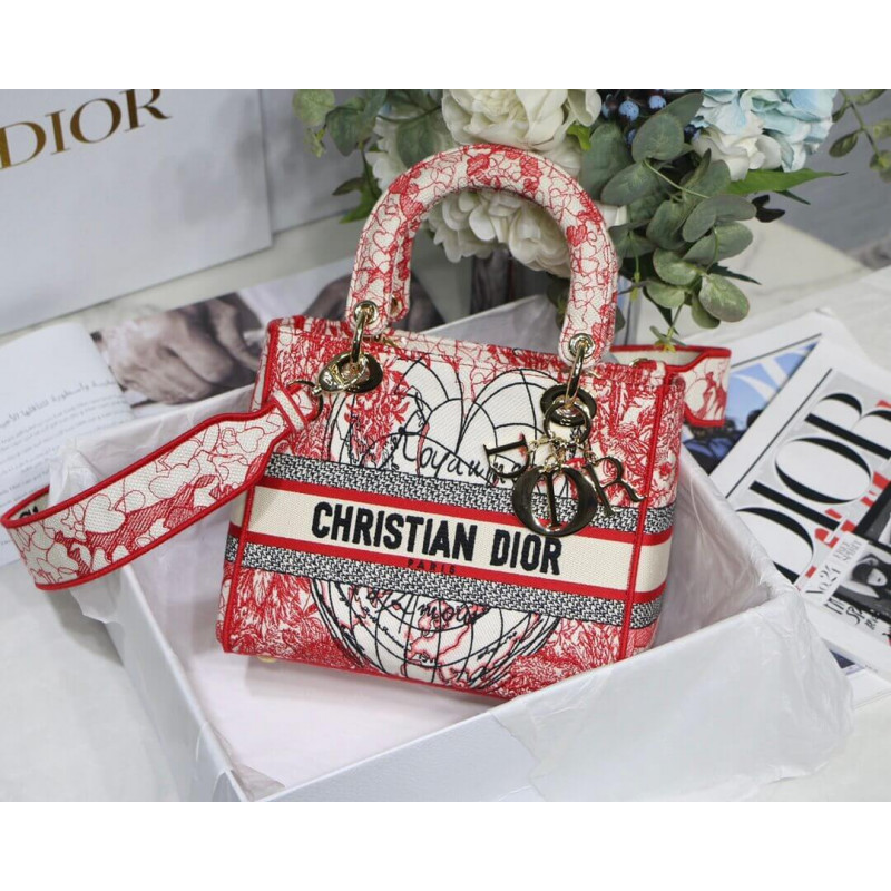 La borsa di Lady D-Lite, parte della capsula di dioramour, combina eleganza classica con la modernità della casa. Lo stile è completamente ricamato con un motivo D-Royaume d’Amour rosso e bianco, ispirato all’artista Pietro Ruffo. La parte anteriore presenta una firma di Christian Dior mentre lo spesso D.I.O.R. ‘ I ciondoli in metallo pallido-finsh-finish migliorano ulteriormente la silhouette. Equipaggiato con una tracolla ampia, reversibile e rimovibile ricamata, la borsa D-Lite di Media Lady può essere trasportata a mano, indossata sopra la spalla o Crossbody e può essere coordinata con altre creazioni di dioramour.