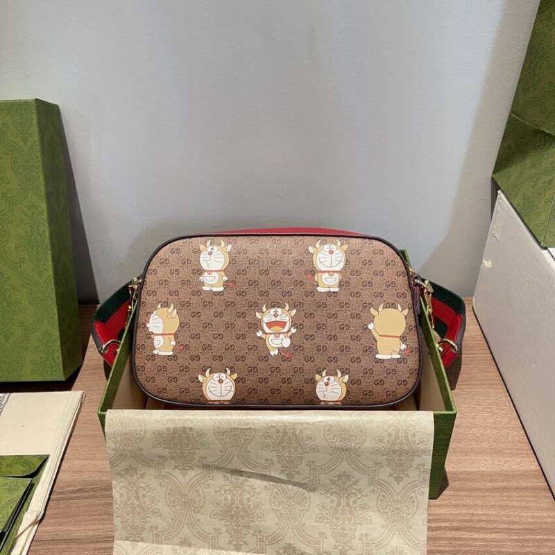 Questa piccola borsa a tracolla fa parte di una collaborazione speciale tra Doraemon e Gucci. Nato il 3 settembre 2112, un robot di tipo gatto fu inviato dal 22 ° secolo per aiutare un ragazzo di nome Nobita con gadget segreti dalla sua sacca a quattro Dimensione. Un personaggio giocoso, Doraemon odia i topi e ama Dorayaki, un pancake dolce.