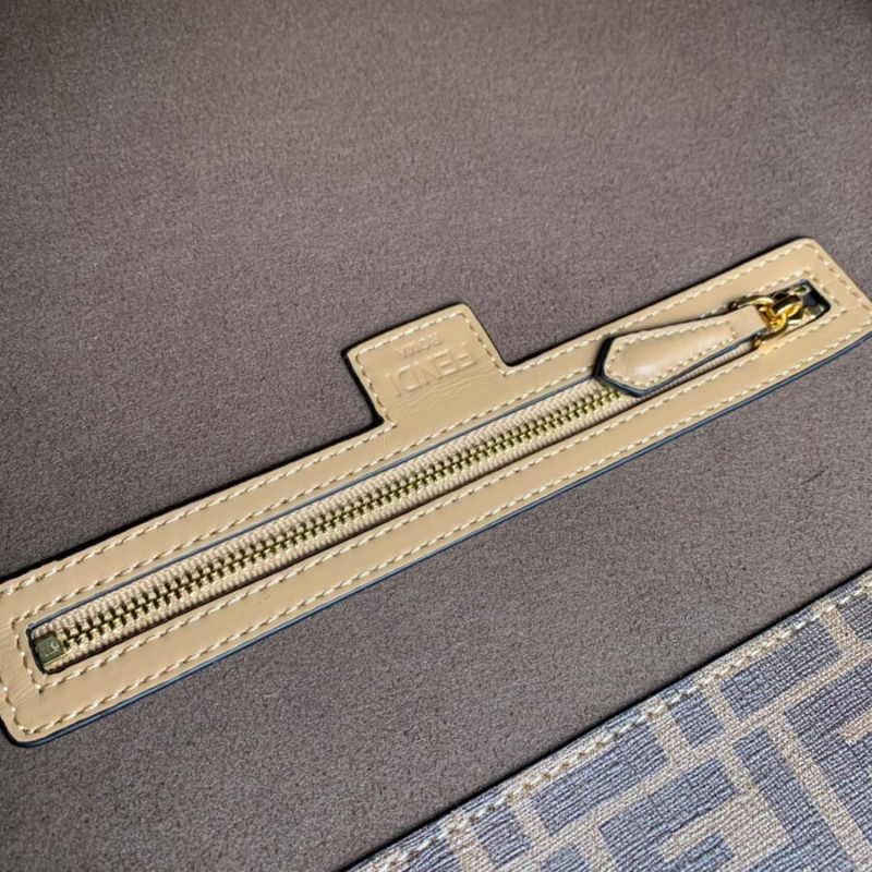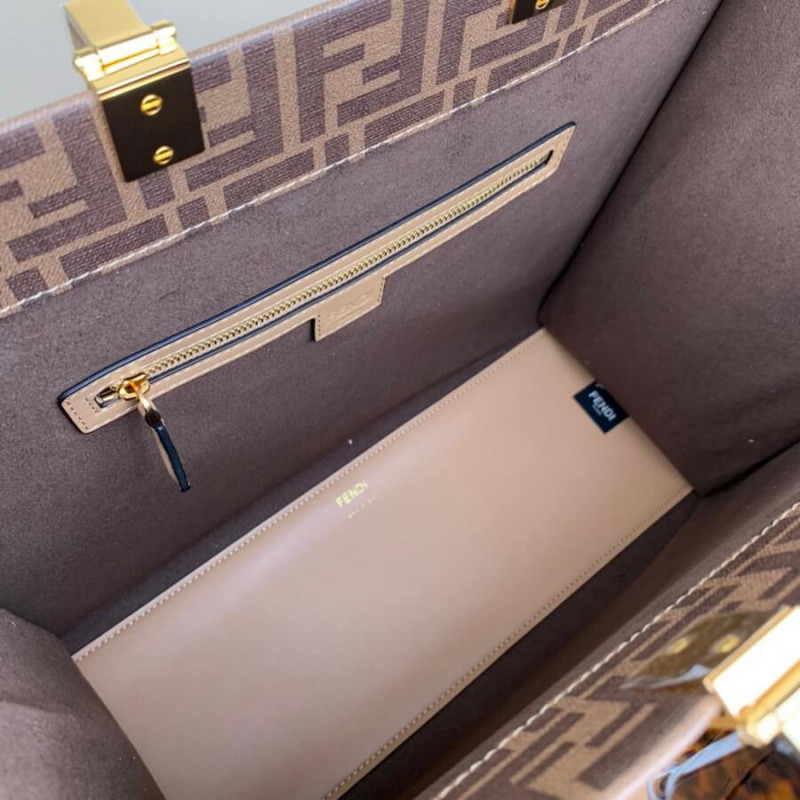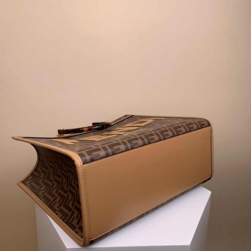 Borsa per acquirente di sole media in tessuto smaltato con cuoio multicolore FF stampato e motivo intarsiato a mano. abbellito con lettere Fendi in rilievo. Le maniglie rigide in plexiglass a effetto tartopolile