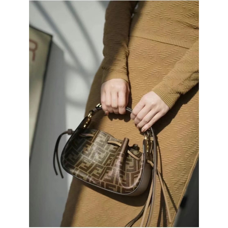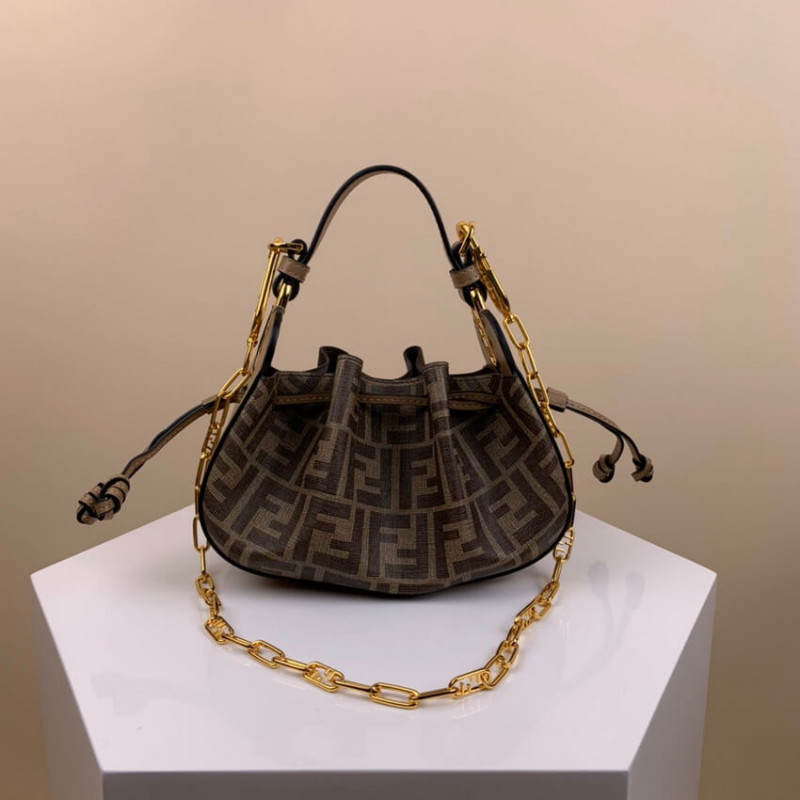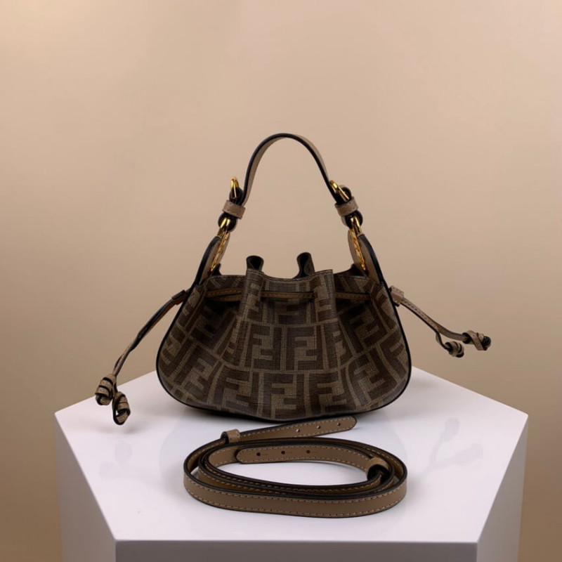 Mini-bag con chiusura corse in tessuto PU con stampa ff marrone. rifinito con dettagli in pelle beige.