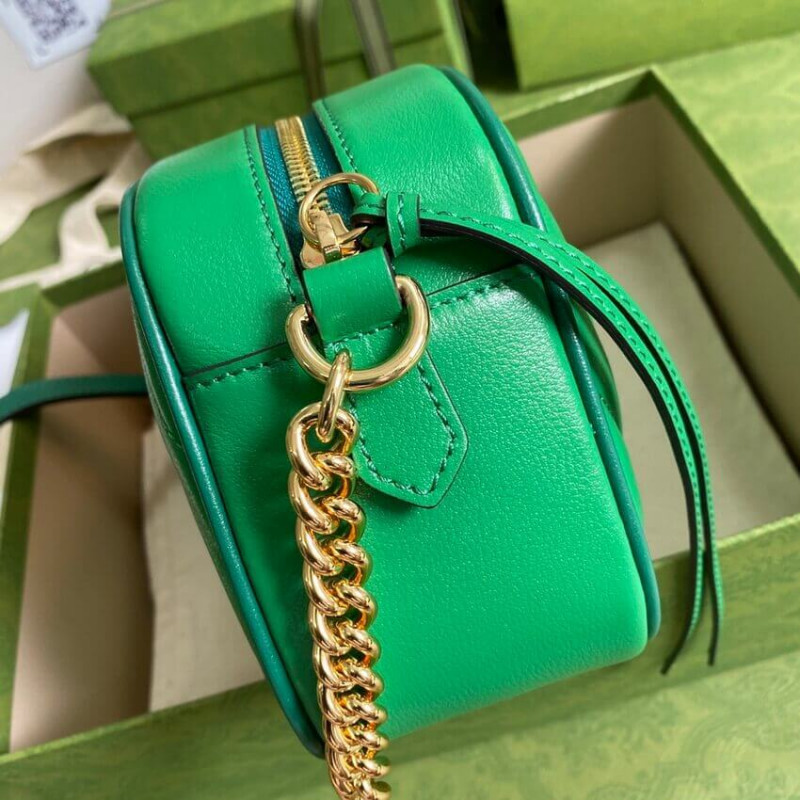 Ricordando i preziosi smeraldi, la borsa GG Marmont viene introdotta in tonalità complementari di pelle verde. L’hardware Double G, una caratteristica di firma della linea, è arricchito con smalto colorato. Lo stile rettangolare è completato da una tracolla a catena, consentendo l’accessorio di essere trasportato in traversa o sulla spalla.