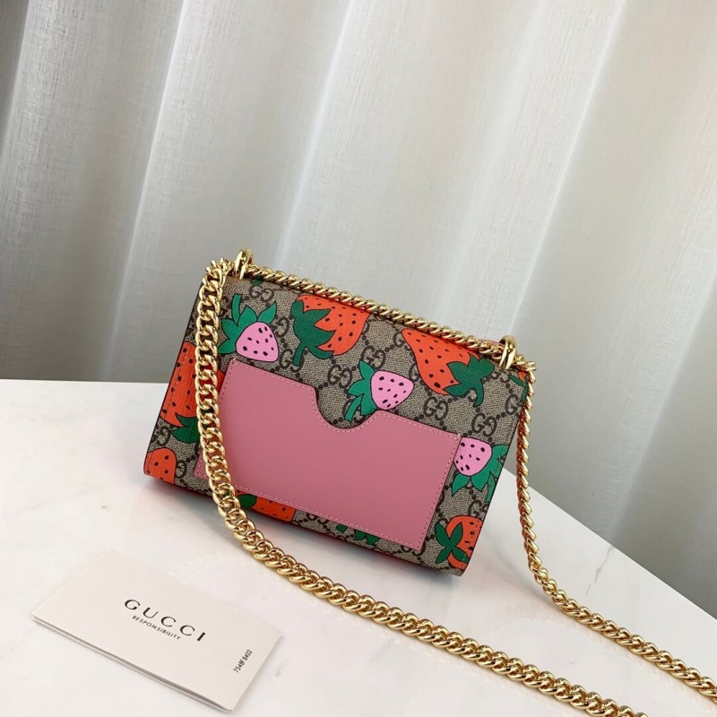 Una interpretazione giocosa della piccola borsa a tracolla sul lucchetto è raffigurata con la colorata stampa di fragole della stagione. La rappresentazione vivida e riccamente grafica di fragole rosse e rosa e il logo Gucci si distingue sullo sfondo supremo GG. Completato con un cinturino a catena scorrevole che trasforma lo stile da una borsa a tracolla in una maniglia superiore.