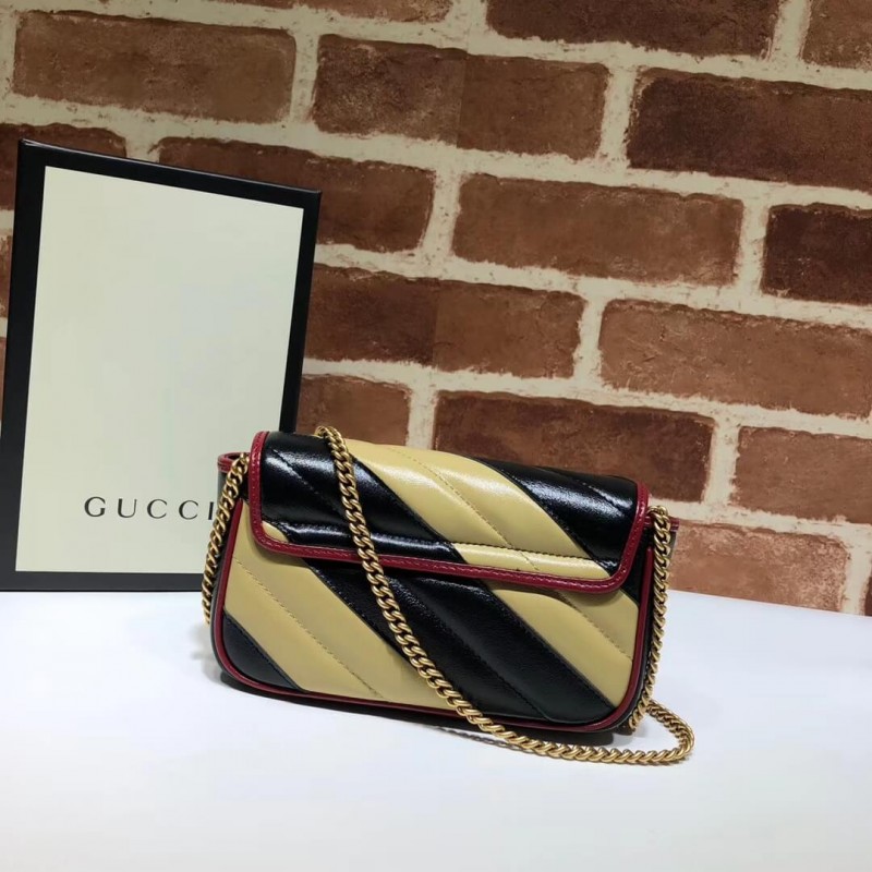 Reinventato per la collezione Pre-Fall 2019, la GG Marmont Super Mini Bag viene introdotta in pelle Matelasse con strisce diagonali. Il piccolo accessorio è completato con una versione testurizzata della doppia g Una versione contemporanea di un dettaglio d’archivio degli anni ’70.