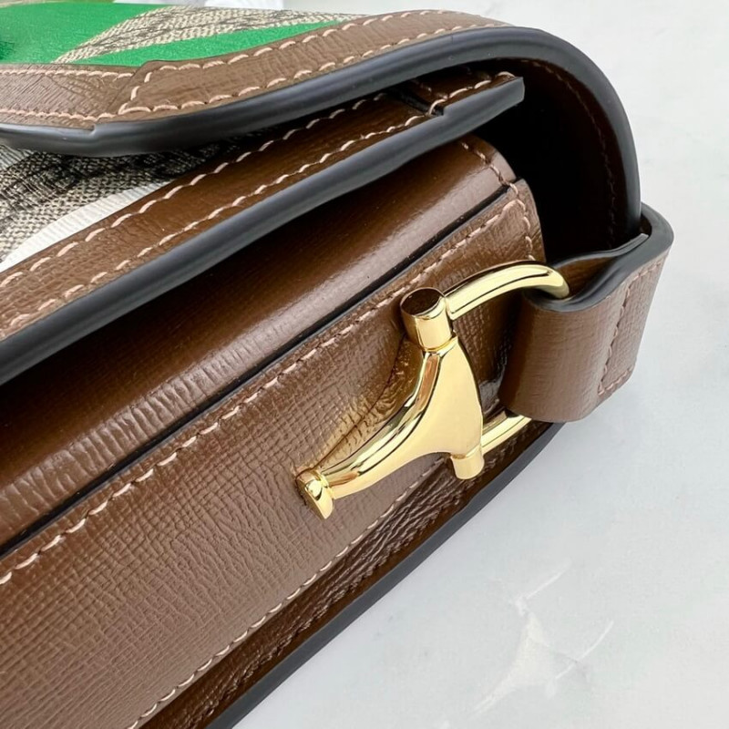 Questo oggetto presenta motivi geometrici luminosi e colorati che ricordano le uniformi indossate dai fantini. La collezione si ispira all’anello della sfilata, o al paddock, dove i cavalli camminano come un riscaldamento prima della gara e per aiutare i corse a scegliere un vincitore. Qui la stampa appare su questa borsa a tracolla Gucci Horsebit 1955.