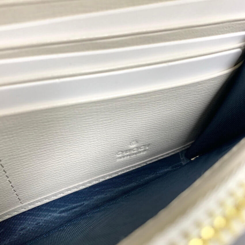 Trasformato dalla sua tradizionale forma di mezzaluna, il Jackie 1961 è reinventato come un portafoglio a catena sottile. La silhouette contemporanea dell’accessorio è abbinata alla tela monogramma della casa e alla striscia web verde e rossa, rafforzando il legame tra passato e presente. Un rivestimento in pelle bianca contrastante completa lo stile.