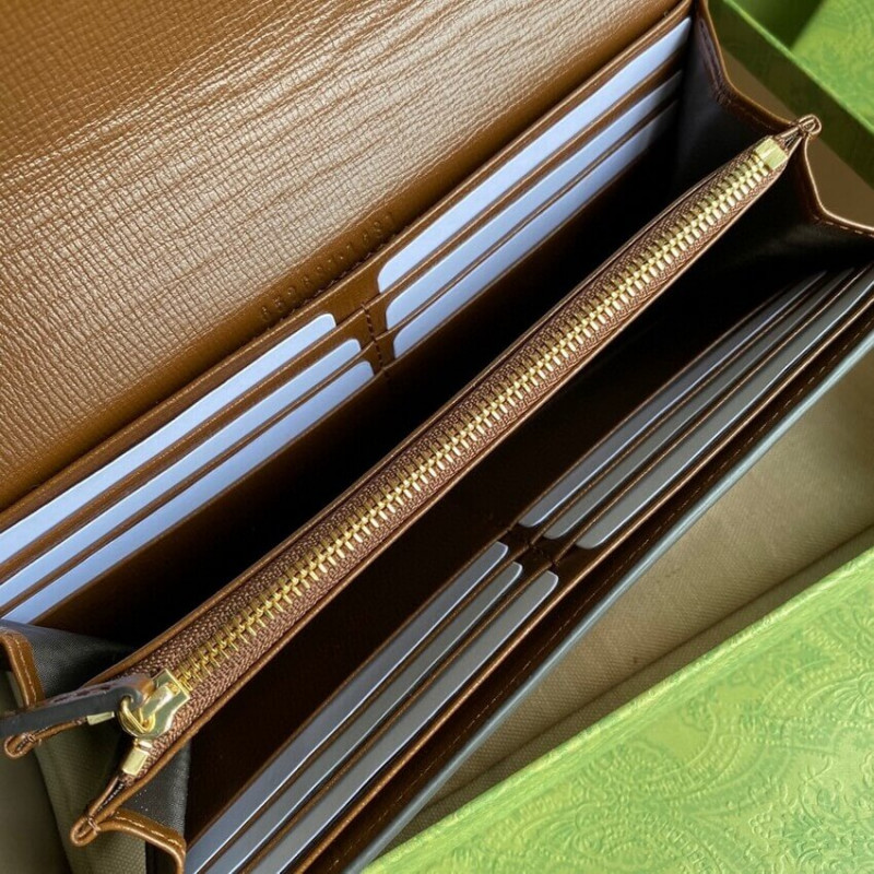 Il mondo di Jackie 1961 si evolve con l’introduzione di un portafoglio continentale con delicata cinghia a catena che consente di indossare come mini borsa. Il dettaglio del pistone dai toni dorati rende omaggio alla borsa originale. Qui, l’accessorio è presentato nella tela monogramma della casa.