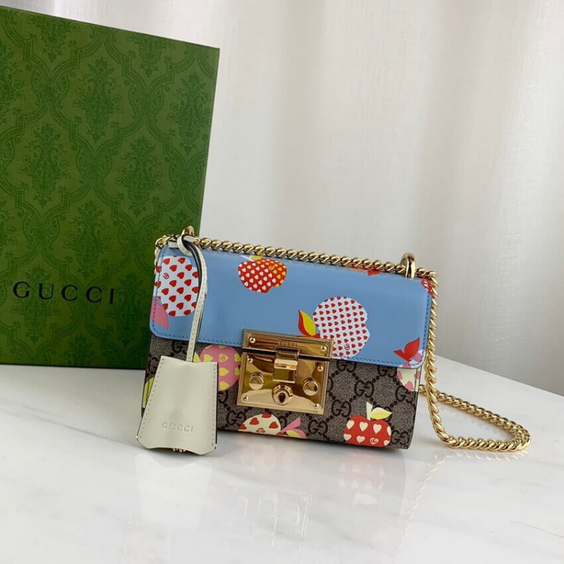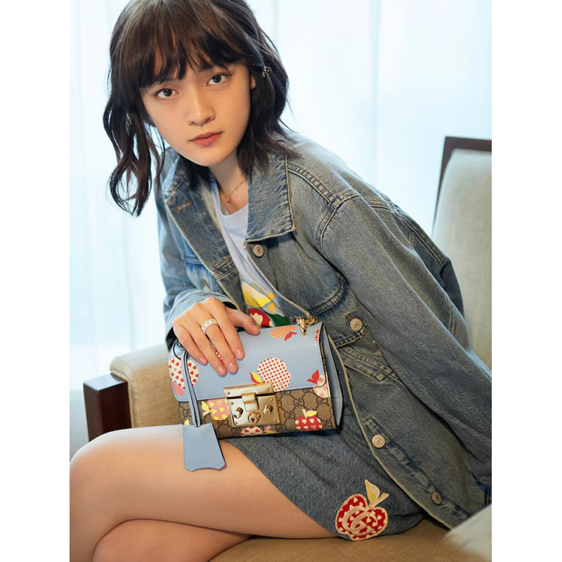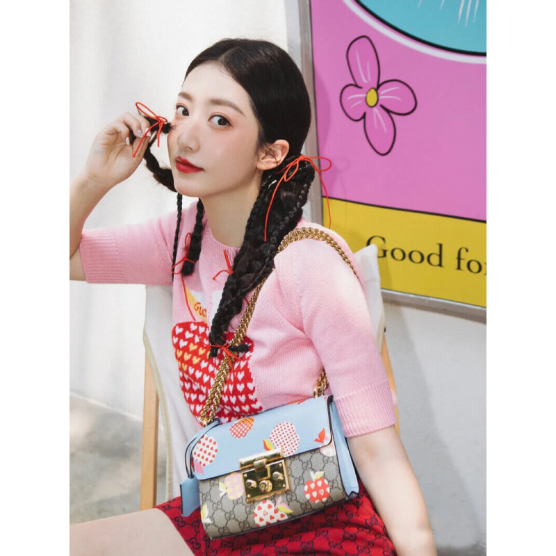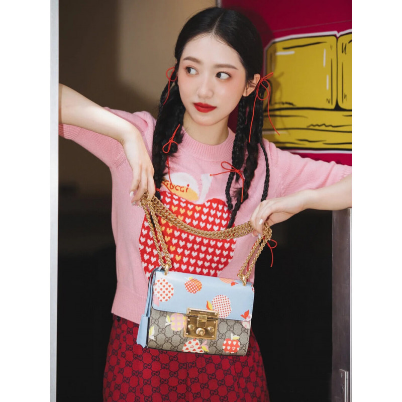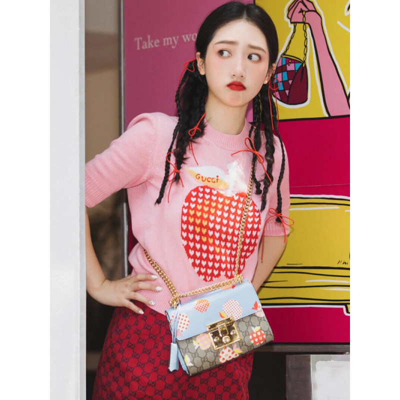 Frutta e verdura diventano gli attuali elementi di moda del marchio, iniettando piena vitalità nella nuova serie, interpretando vividamente l’umore innocente e divertente del marchio. Questa piccola borsa a tracolla della serie di lugnocchettoni utilizza un interessante modello di mela Gucci Heart per riecheggiare il tema.