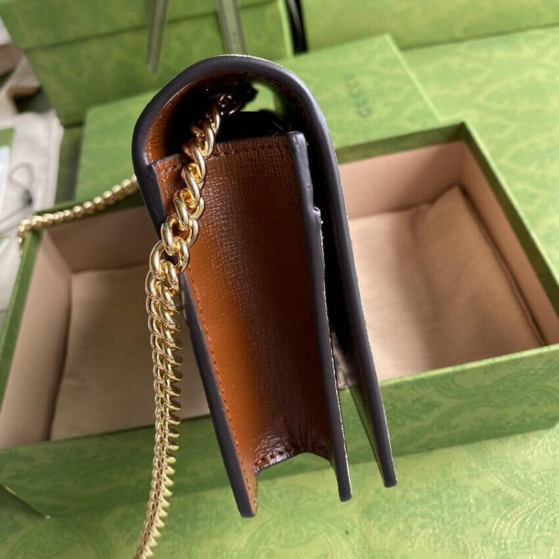 Un portafoglio di cassette a catena realizzato dalla tela monogramma della casa in onore di San Valentino. Un emblema del romanticismo, lo stile presenta un dettaglio a forma di cuore 3D con il logo Gucci.
