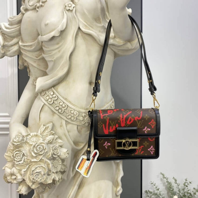 La borsetta mini daughina è realizzata in tela monogramma, con alcuni fiori di monogramma nel motivo reso in rosa femminile e rosso vibrante. Presenta il blocco del cerchio LV immediatamente riconoscibile del Dauphine ed è firmato con un Louis Vuitton che sembra essere scritto con il giocatore di rossetto. rivestimento