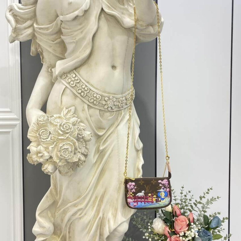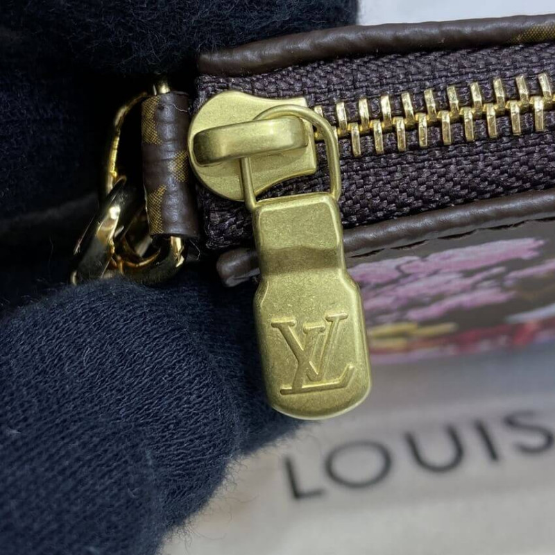Il mini Accessores a Pochette è realizzato in tela monogramma e decorata con una stampa di Vivienne, la mascotte della casa, in un giardino giapponese. Si trova sotto un ombrello di Wasaga mentre un curioso gatto bianco guarda. La chiusura zip della tasca protegge ciò che è dentro; La catena consente di essere attaccato a una borsa più grande.