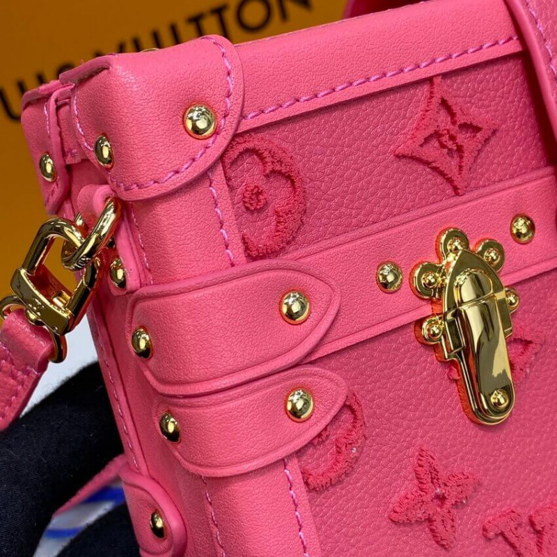 Un’esplosione di rosa, questa piccola borsa da malle è realizzata in pelle di vitello trapuntata con un rivestimento tono-su tono. L’artigianato del tufting è impressionante: il modello di monogramma è delicatamente ricamato nella pelle a grana, con i fili tagliati per creare una sensazione vellutata. Questo monogramma trapuntato porta un respiro di modernità a questo design iconico.