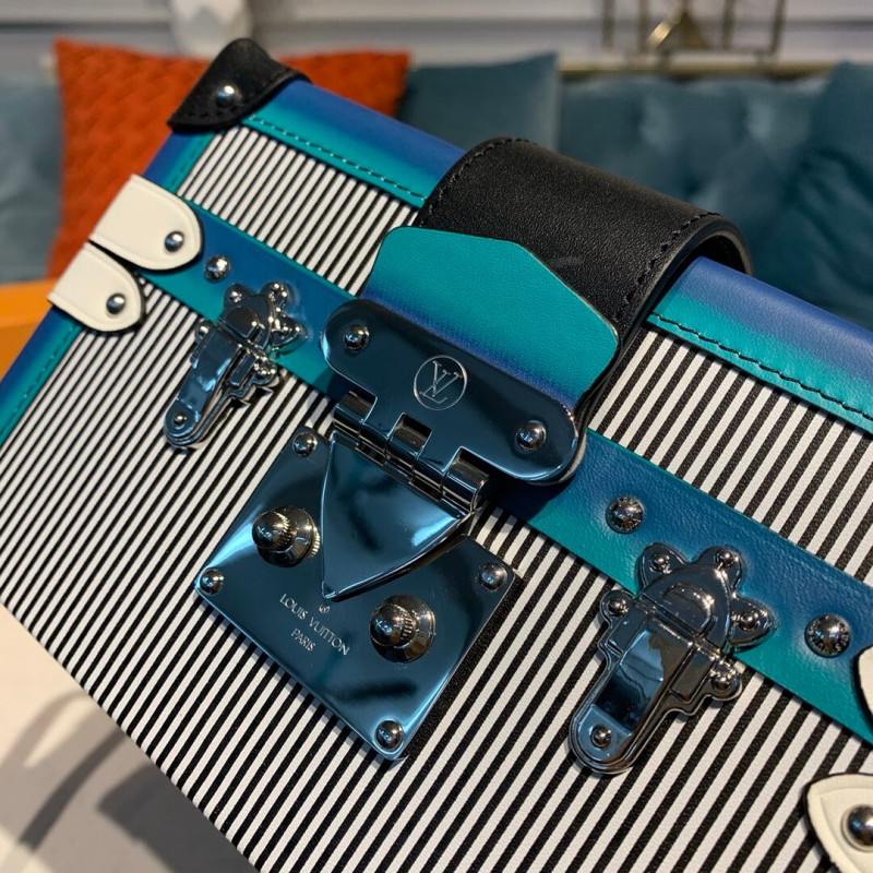 Strisce ipnotiche e colori sorprendenti si combinano su una borsa da Malle Petite accattivante, creata per la primavera-estate 2019. Il modello verticale in bianco e nero è abilmente dipinto a spruzzo sulla pelle di questo piccolo tronco impeccabile, che può essere trasportato come trasportato come trasportato come trasportato come trasportato una frizione o attaccata al suo cinturino regolabile per la spalla o l’usura a croce.