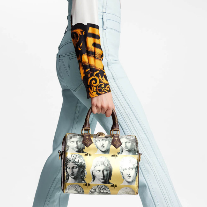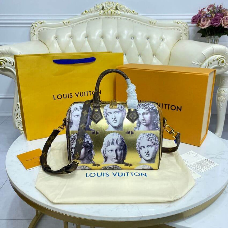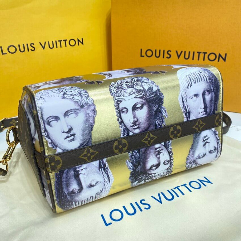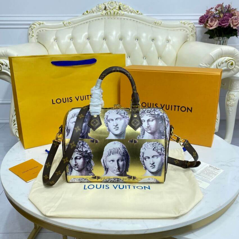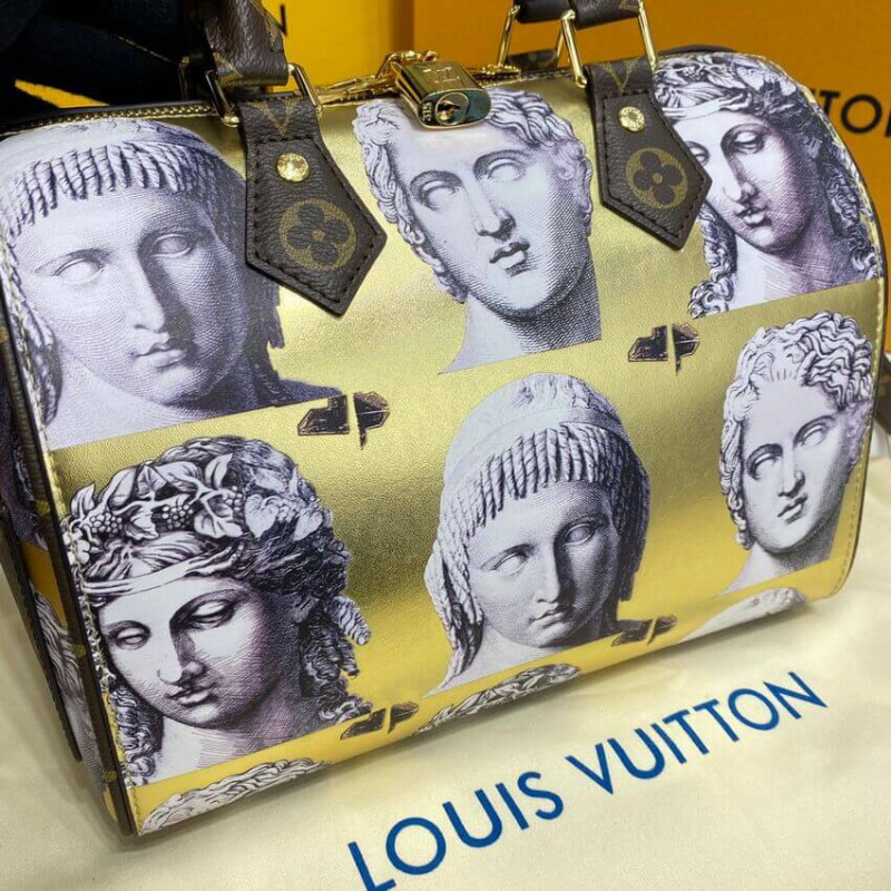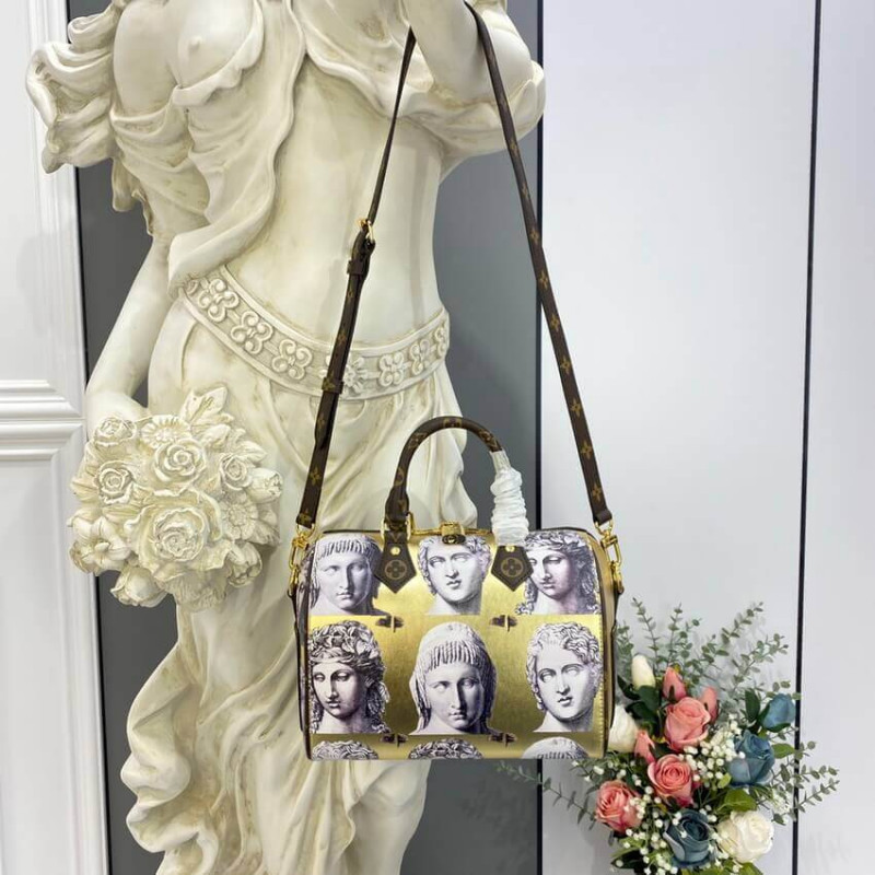 Questa rapida borsetta di Bandouliere 25 è realizzata in pelle metallica dorata adornata con stampe di teste di statua create dal famoso artista italiano Piero Fornasetti. Il rivestimento in tela monogramma e l’hardware a colori dorati finiscono il design di questa splendida borsa. Ha due maniglie in pelle arrotolata e una tracolla in pelle regolabile.
