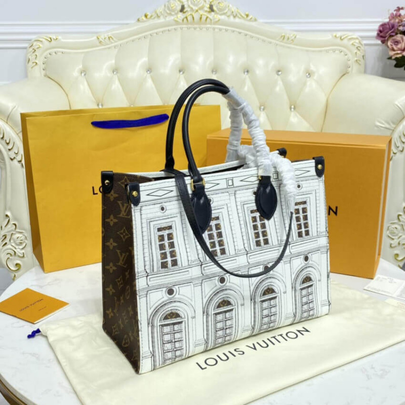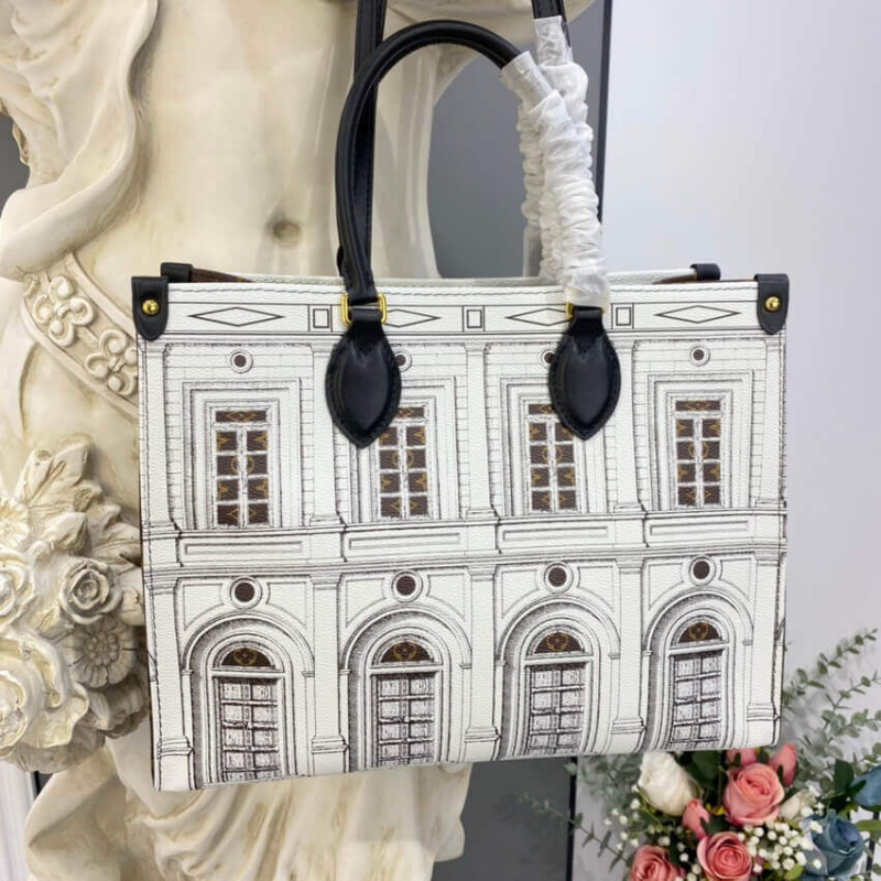 Parte della capsula LVXFornasetti LVXFornasetti, questa sorprendente tote di architetttura MM è realizzata in pelle di vitello opaca stampata, con rivestimento in tela monogramma. La pelle liscia imita la pietra, su cui vengono disegnati edifici immaginari nel modo di firma Fornasetti. Fashion and Function si combinano in questo trasporto spazioso, ideale per l’usura per uffici o in città.