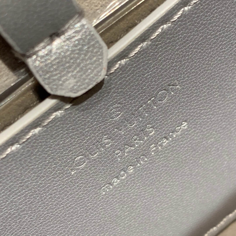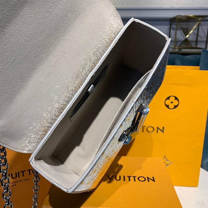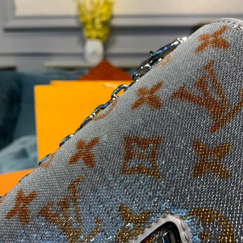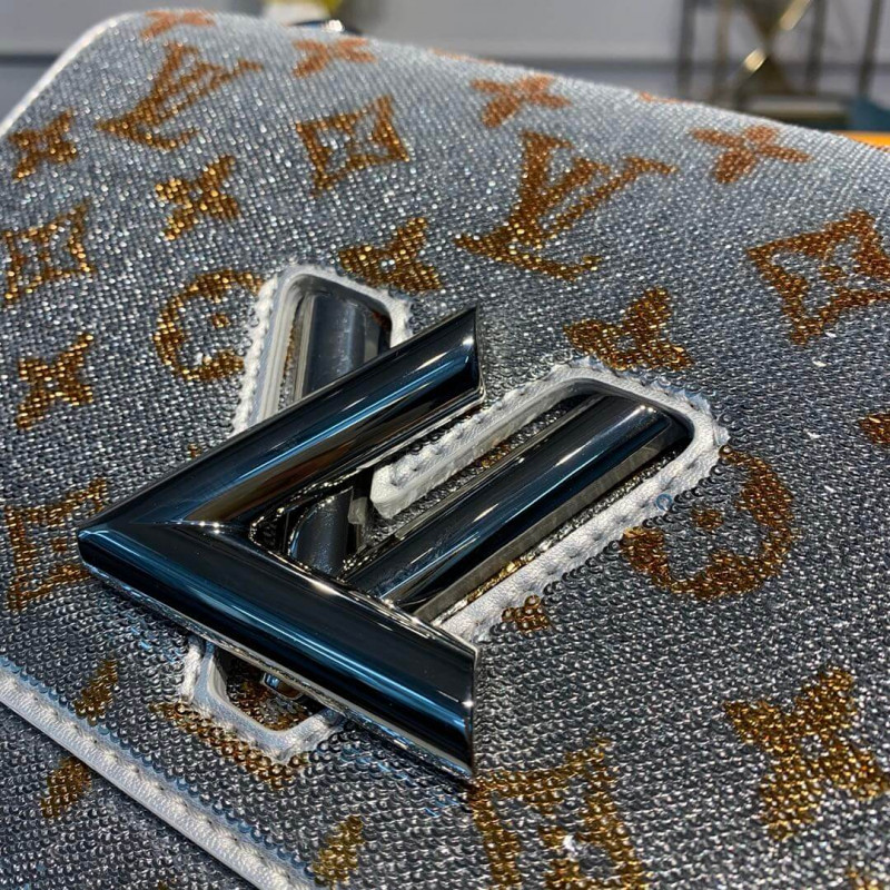 Questa eccezionale edizione di The Emblematic Twist MM Hantal combina l’artigianato in pelle di Louis Vuitton con tecniche di couture. La pelle liscia è densamente ricamata con paillettes argento e tono d’oro per creare un motivo di monogramma luccicante. Quando questa borsa glamour cattura la luce, l’effetto è ipnotizzante.