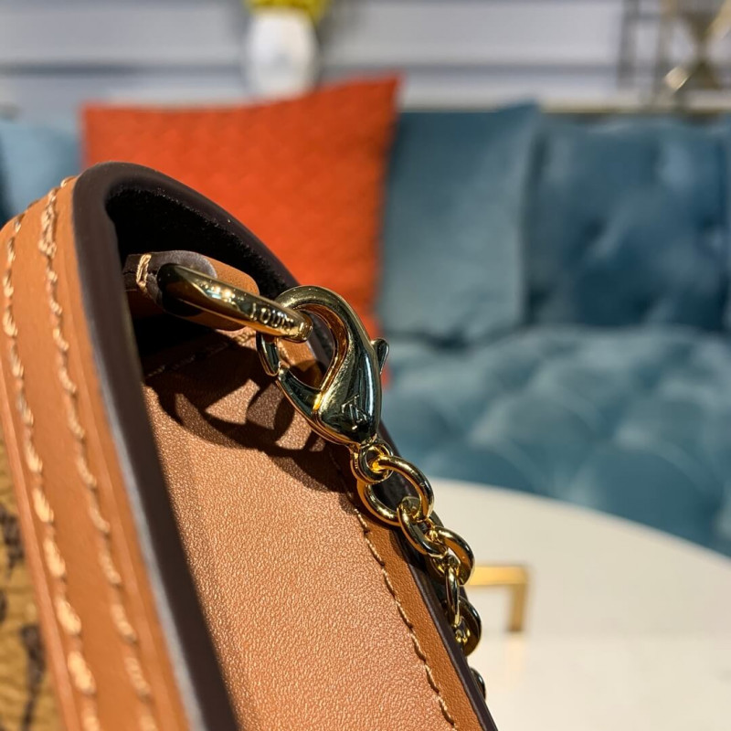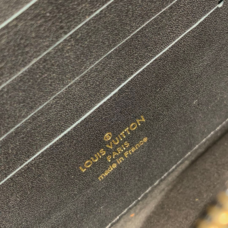 Combinando la tela inversa del monogramma, il portafoglio della catena del dauphine riprende tutte le firme dell’iconica collezione dauphine: l’aspetto vintage, il rivestimento in pelle di vitello e la chiusura del cerchio LV. Questo portafoglio ordinato ma spazioso presenta una catena tono oro rimovibile, che consente di trasportare in diversi modi.