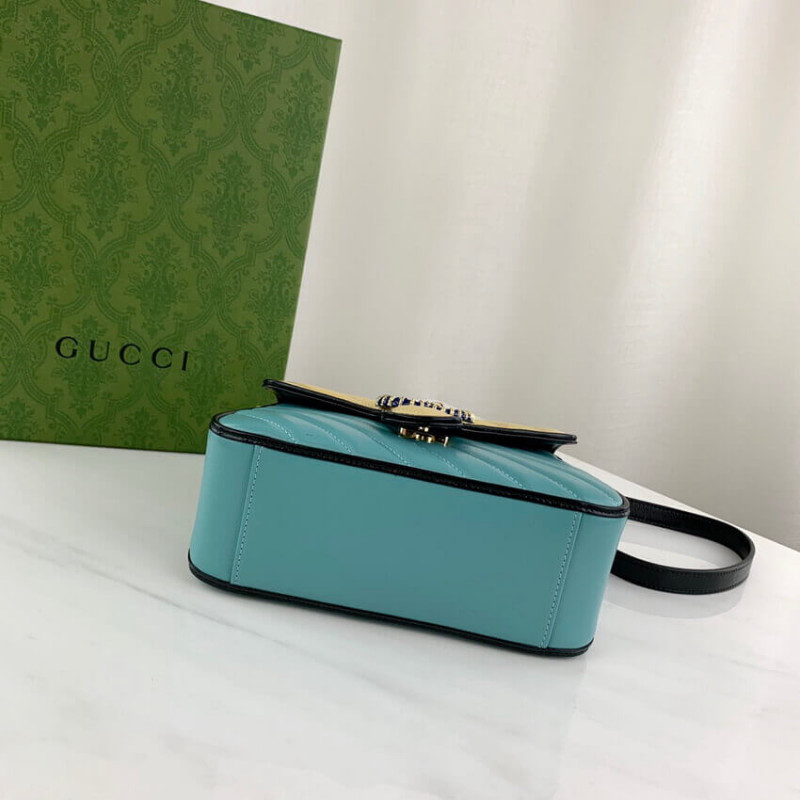 Le tonalità morbide appaiono durante le ultime collezioni, aggiungendo un’atmosfera stravagante. La borsa GG Marmont è presentata nella pelle trapuntata da matelasse diagonale in morbide tonalità di burro e blu. La forma distinta del Mini Top Hand della maniglia top è delineata nelle tubazioni nere, evidenziando la sua chiusura a patta.